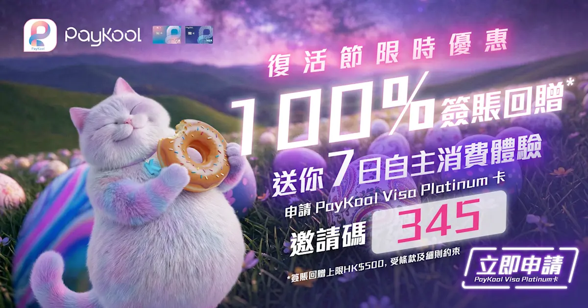PayKool復活節送你7日自主消費體驗!,推廣期內新客戶輸入優惠碼「345」申請 PayKool Visa Platinum卡,成功批核後 7日內消費可享100%簽賬回贈*,最高回贈HK$500!